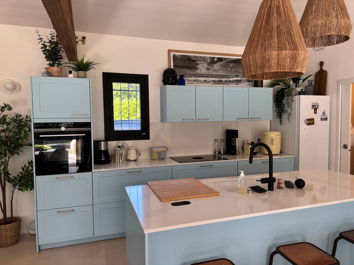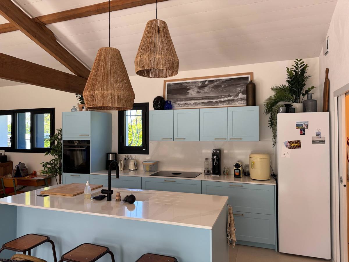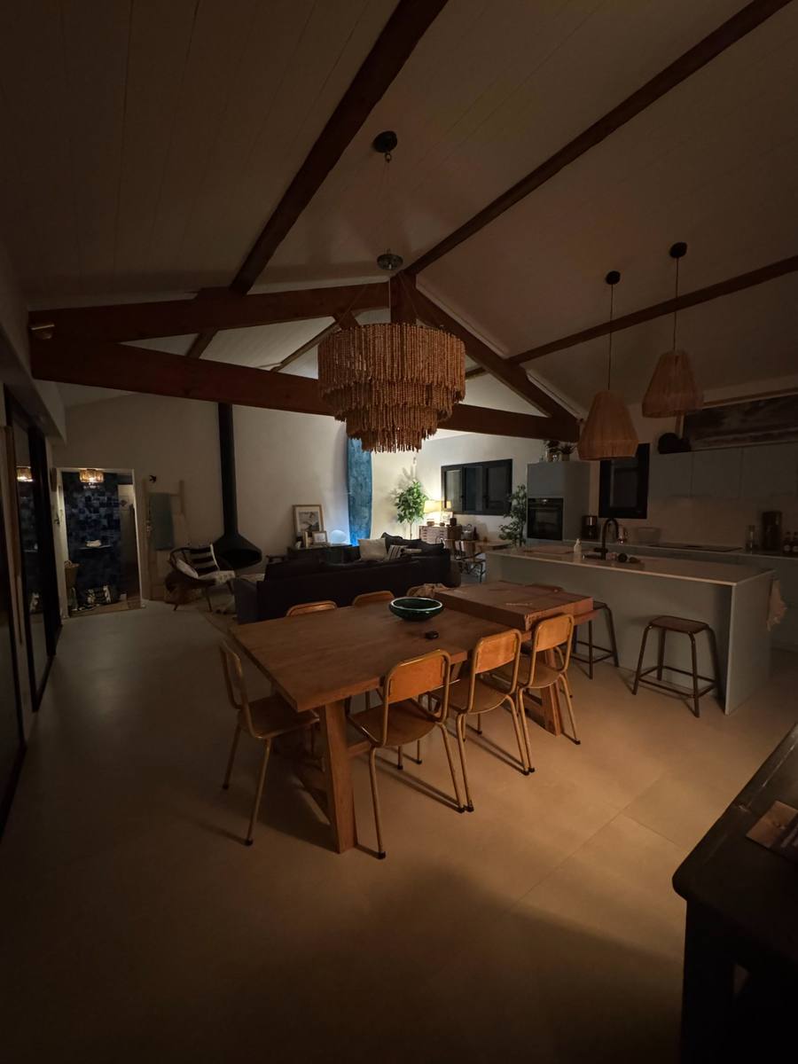 Le grand séjour en cathédrale de 50 m², avec ses poutres apparentes et sa cheminée suspendue, ouvre sur la cuisine bleu lagon et la salle à manger. Le tout débouche sur la pergola et le jardin via de grandes baies vitrées.