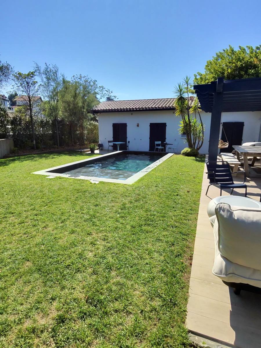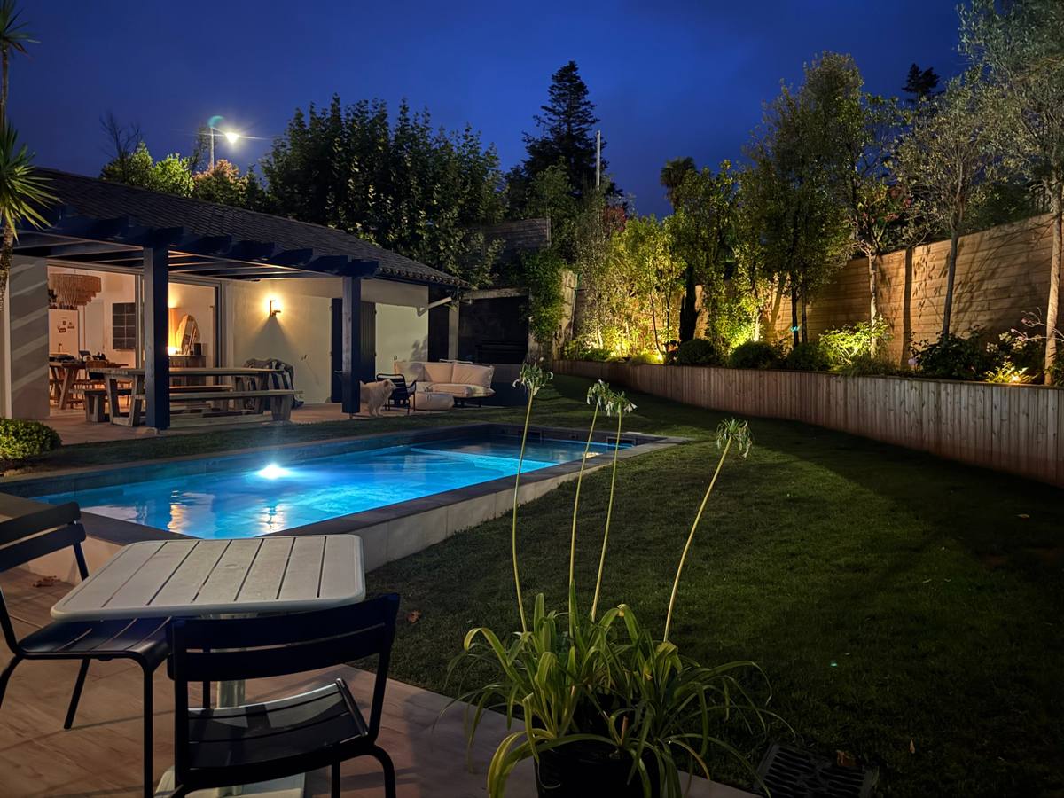 Le jardin suit le rythme du lever et du coucher du soleil pour une ambiance naturelle. La piscine chauffée, la pergola motorisée et la cuisine d'été font de cet espace un véritable lieu de vie.