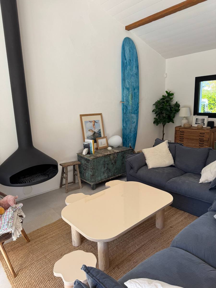 L'ambiance surf-loft basque s'exprime à travers le longboard bleu en déco, les luminaires en jonc de mer et les matériaux naturels.