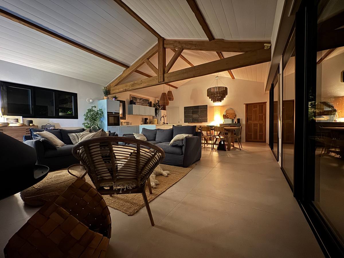 Le grand séjour en cathédrale, avec ses poutres apparentes et sa cheminée suspendue, ouvre sur la cuisine bleu lagon et la salle à manger. Le tout débouche sur la pergola et le jardin via de grandes baies vitrées.